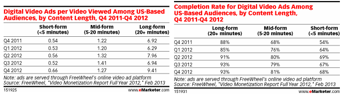 Le taux d’affichage complet des annonces publicitaires est quant à lui plus élevé pour les vidéos long format, à 93%, contre 81% pour les vidéos moyen-format et de 68% pour les vidéos courtes. Enfin, les trois catégories de vidéos affichent des taux de visionnage plus élevés au quatrième trimestre 2012 qu’au trimestre précédent.